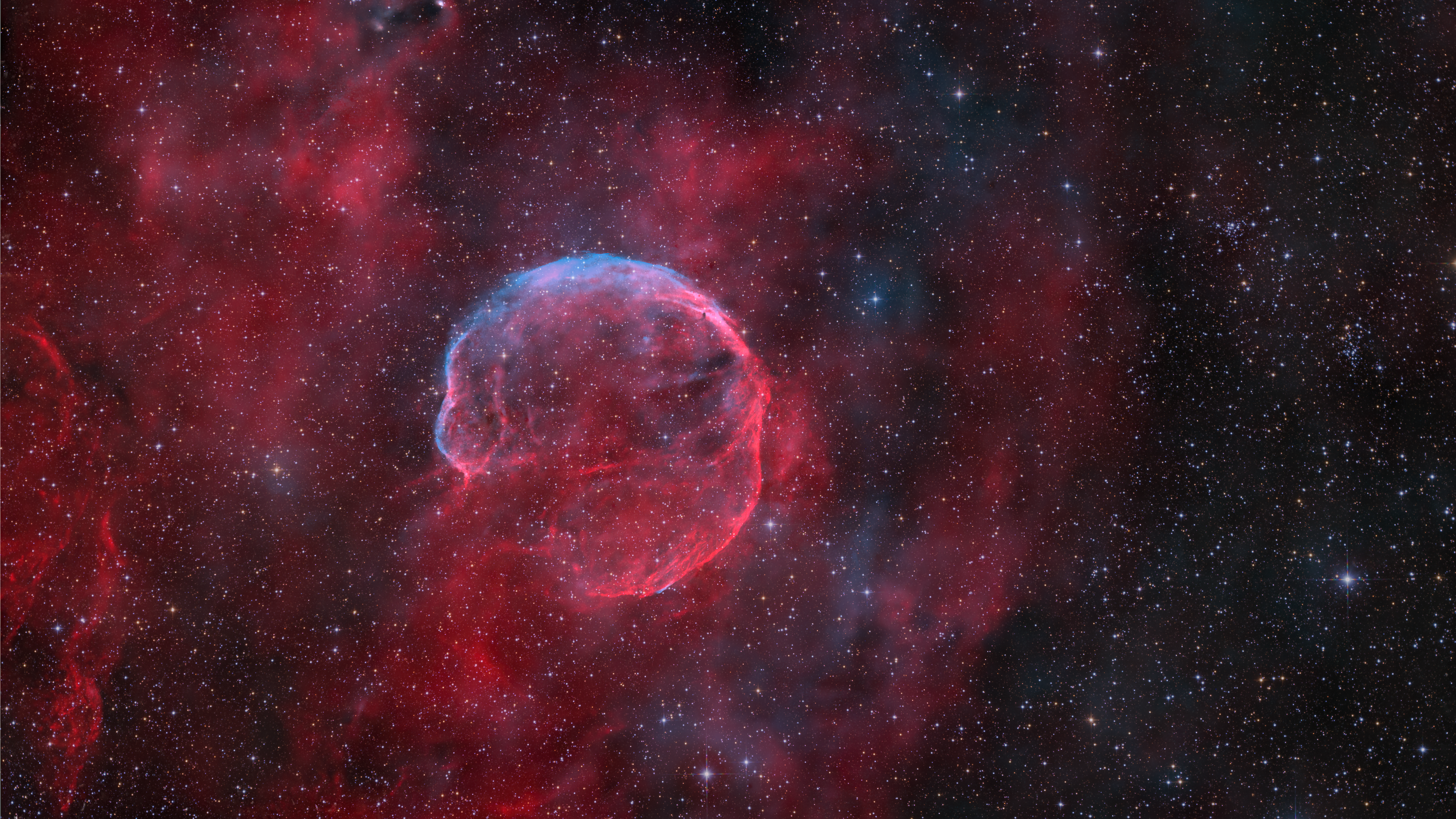 Abell 85 (CTB 1) zeigt faszinierende OIII-Filamente am Rand seiner großen Hülle. Sein Alter wird auf etwa 10.000 Jahre geschätzt, was auf die Explosion eines massereichen Sterns vom Typ B oder O in einer Entfernung von etwa 10.000 Lichtjahren hinweist. Dieser Überrest ist ein beeindruckendes Beispiel für die sich entwickelnde Astronomie und die Wunder des Universums.