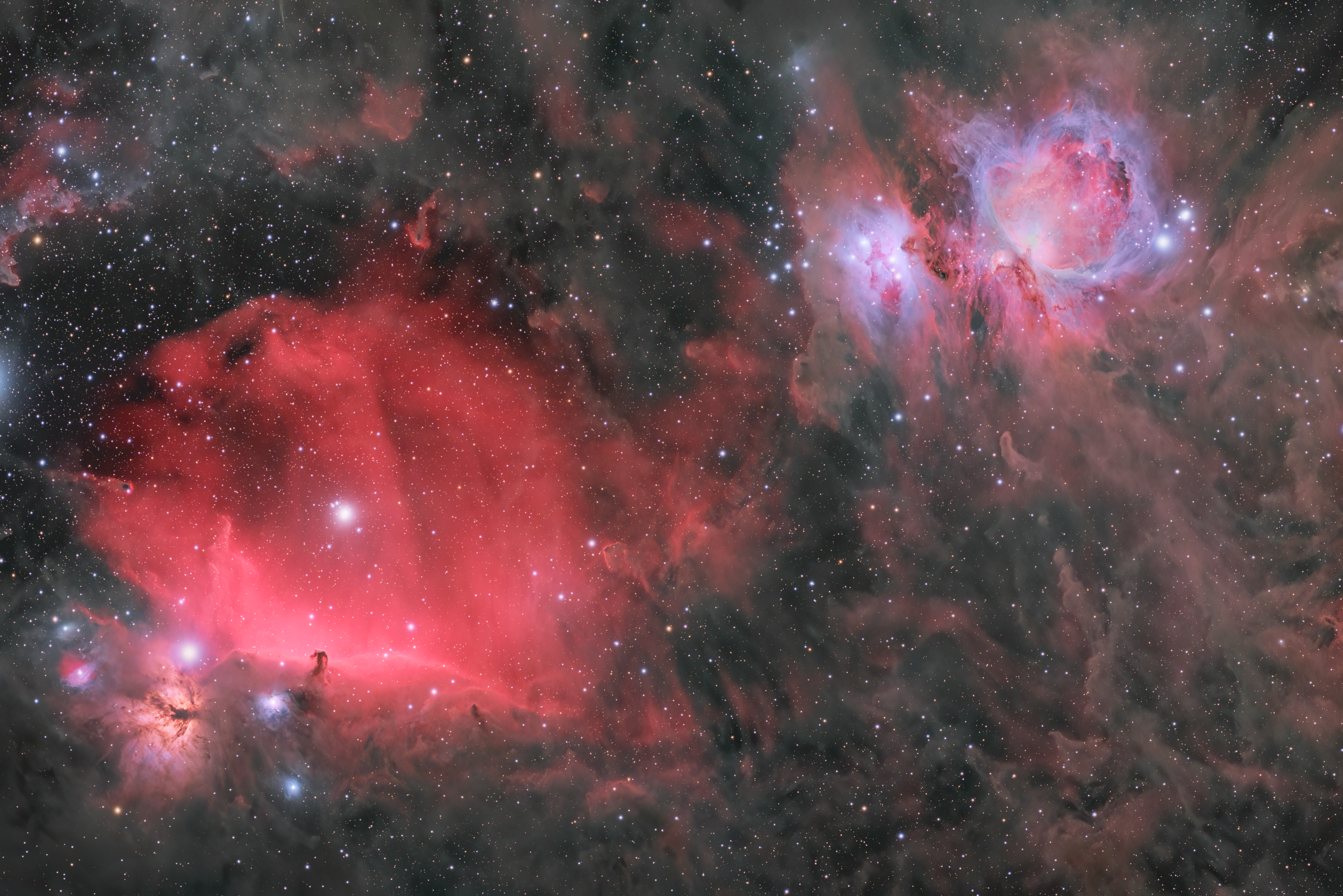 IC 434, ein Wasserstoffemissionsnebel im Sternbild Orion, liegt etwa 1.500 Lichtjahre entfernt und erstreckt sich über 10 Lichtjahre. Seine rötliche Strahlung wird durch UV-Licht des nahen Sterns Alnitak ionisiert. Der berühmte Pferdekopfnebel, eine dichte Dunkelwolke aus Staub und Gas, hebt sich eindrucksvoll vor diesem Hintergrund ab.