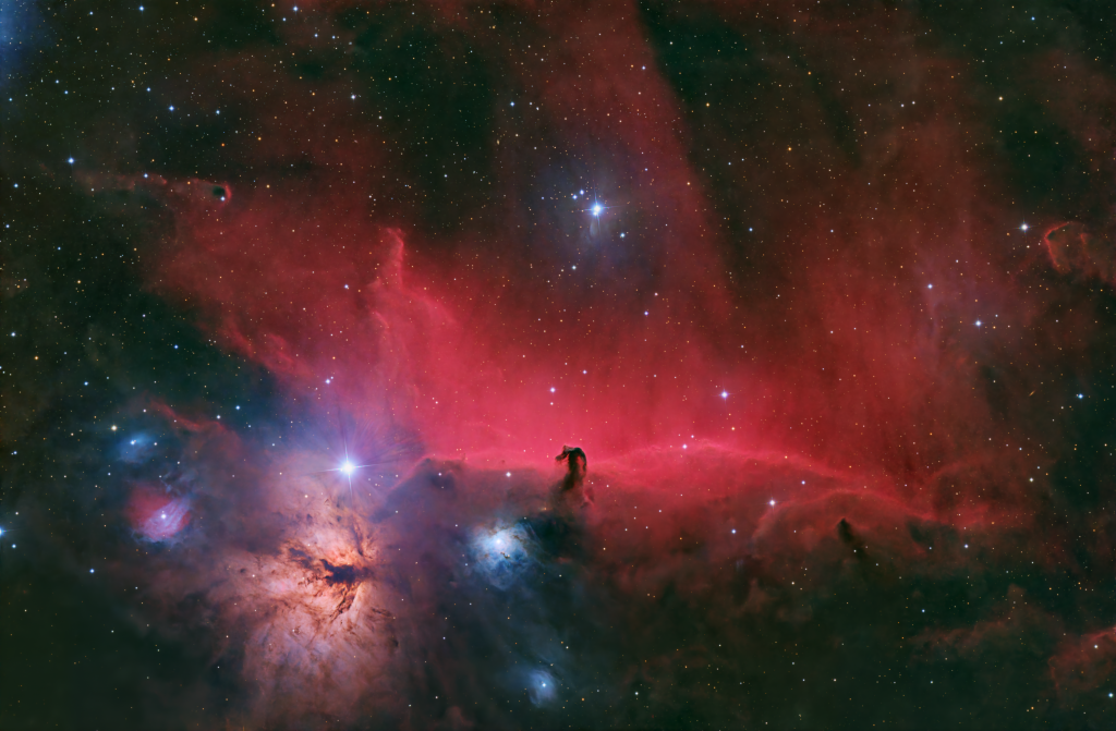 Auch 2023 habe ich mich wieder an den Pferdekopf- bzw. Flammennebel gewagt. Diese Jahr allerdings mit meinem schnellen Newton. Zum Vergleich, mit meinem f5 Newton hätte ich 8,5 Stunden belichten müssen, um die gleiche Menge an Photonen zu sammeln.