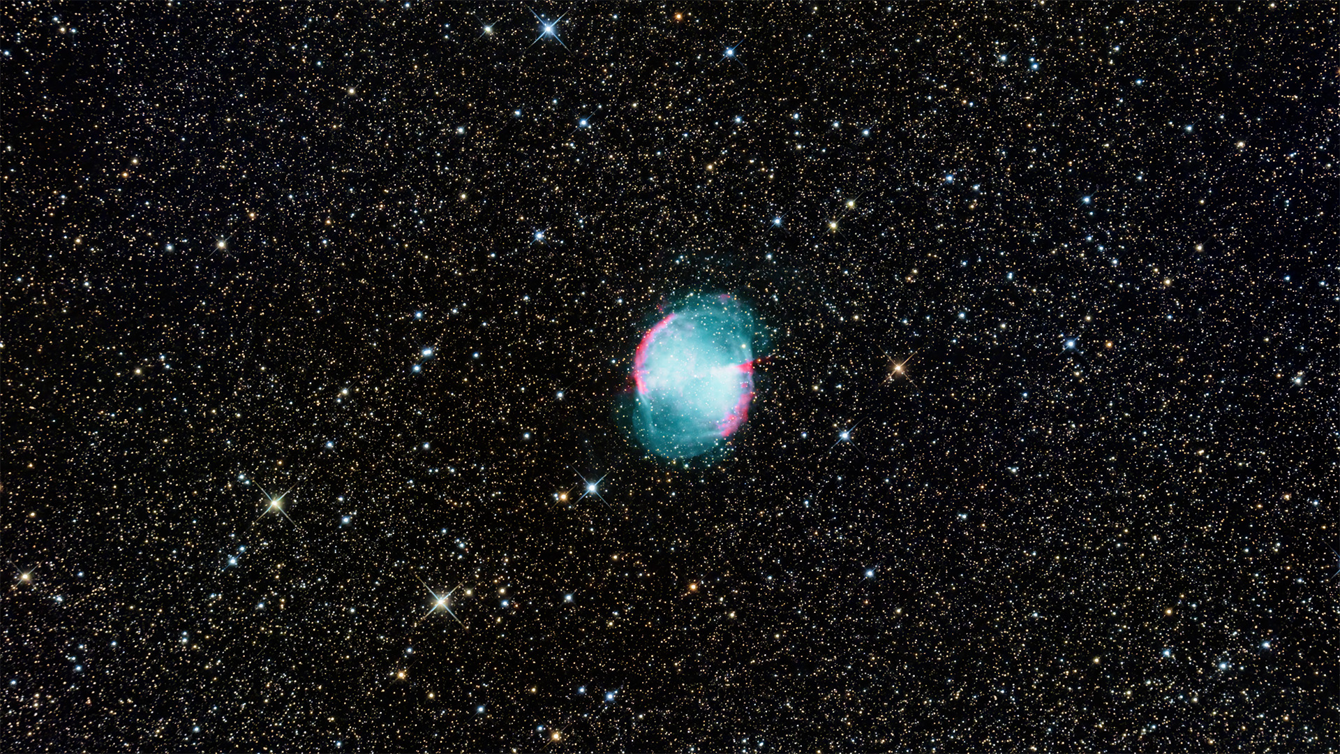 M27, auch bekannt als Hantelnebel, ist ein planetarischer Nebel im Sternbild Füchschen und ist etwa 1.360 Lichtjahre von der Erde entfernt. Er hat eine hantelförmige Erscheinung und entsteht durch die Abstrahlung von ionisiertem Gas aus einem heißen Weißen Zwerg, dem Überrest eines alten Sterns.