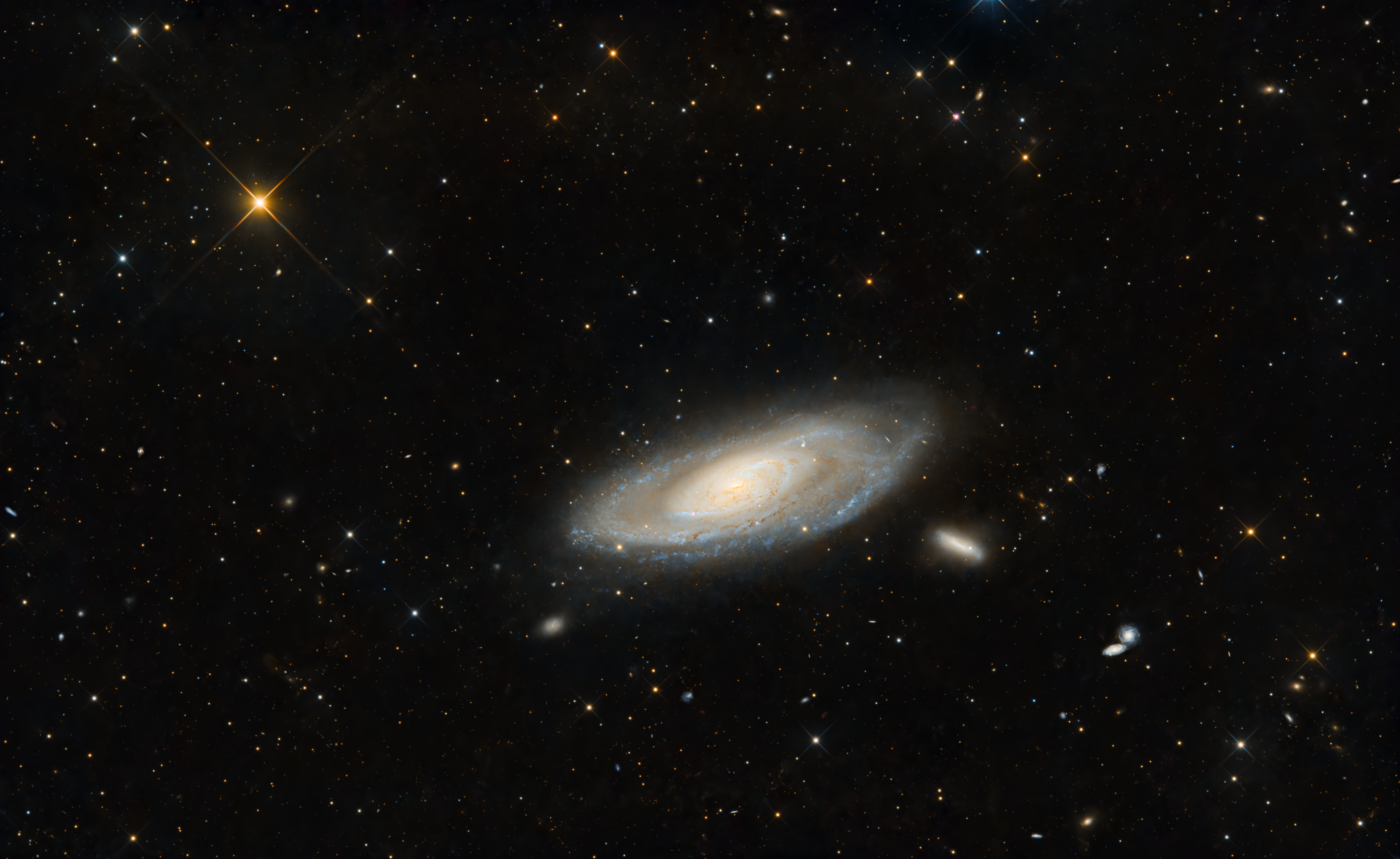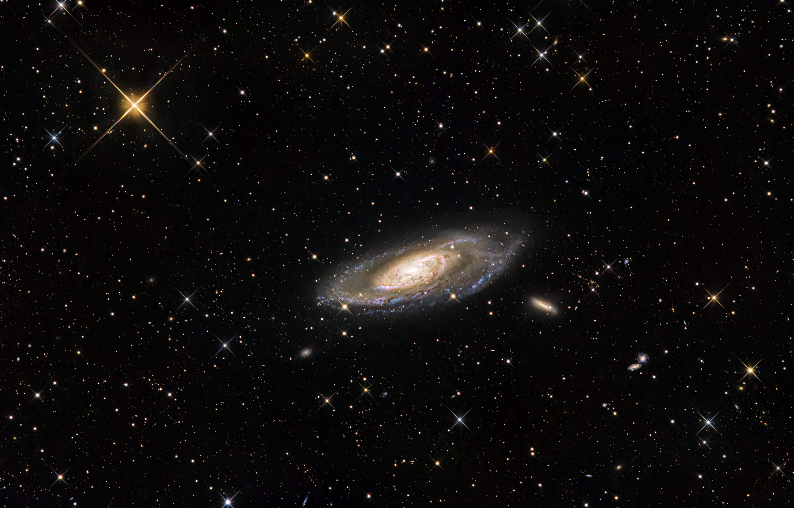 Messier 106 ist eine spektakuläre Spiralgalaxie, die sich in einer Entfernung von 23,5 Millionen Lichtjahren von der Erde befindet. Die Galaxie zeichnet sich durch ihre markante Balkenstruktur und zahlreiche Sternentstehungsgebiete aus. Der aktive galaktische Kern wird von einem supermassereichen Schwarzen Loch angetrieben, das eine Masse von etwa 40 Millionen Sonnenmassen hat.