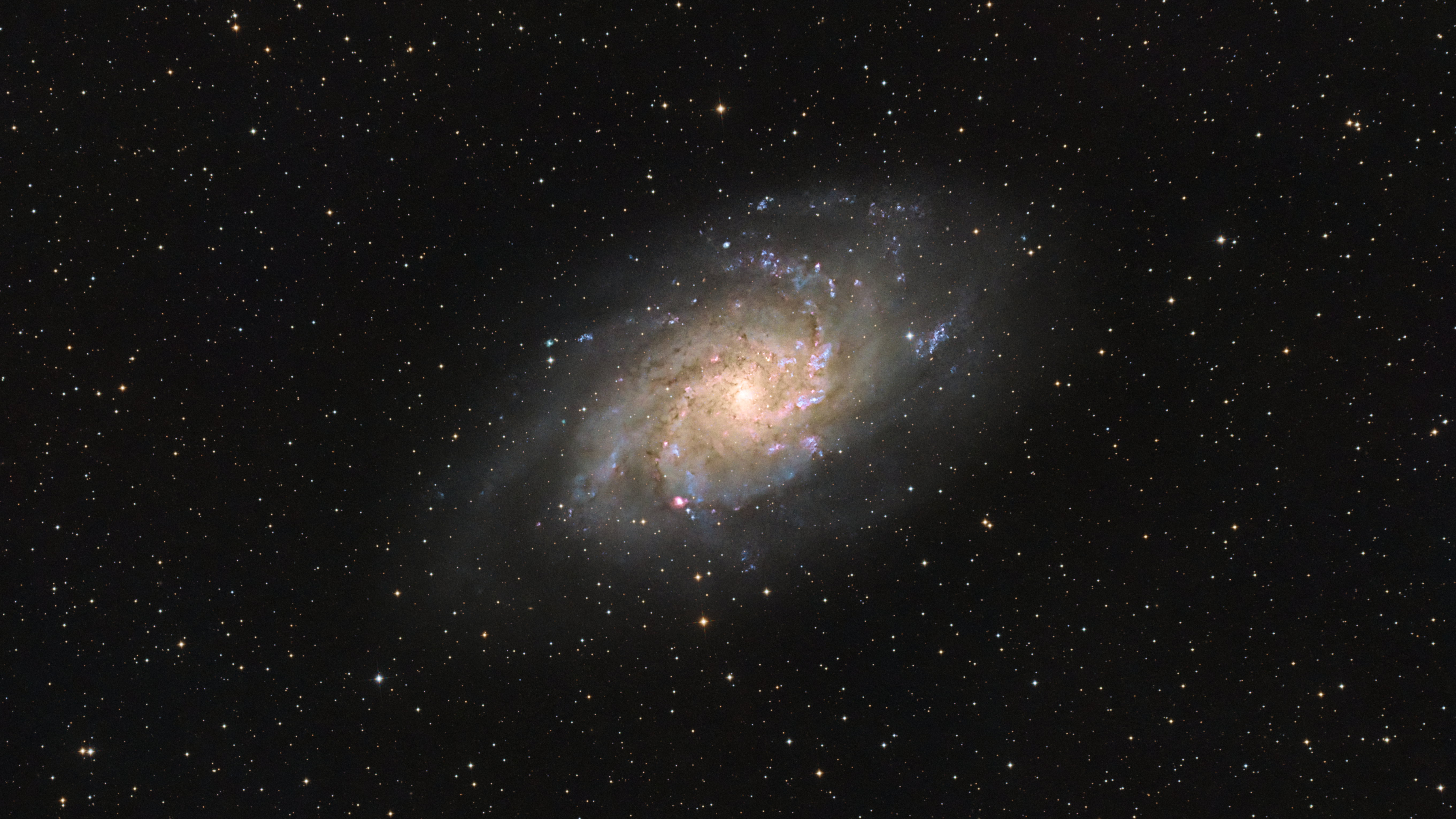 Messier 33, auch als Dreiecksnebel oder NGC 598 bekannt, ist eine Spiralgalaxie im Sternbild Triangulum. Mit einer Entfernung von etwa 2,7 Millionen Lichtjahren ist M33 die drittnächste Spiralgalaxie zur Milchstraße, nach der Andromedagalaxie (M31) und der Dreiecksgalaxie (M32). Der Dreiecksnebel ist etwa 60.000 Lichtjahre im Durchmesser und enthält eine Vielzahl junger, heißer Sterne sowie leuchtende Gas- und Staubregionen.
