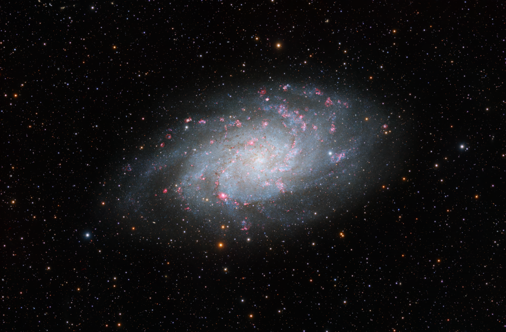 Die Messier 33, oder Triangulum-Galaxie, ist eine Spiralgalaxie in etwa 2,7 Millionen Lichtjahren Entfernung und zählt neben der Andromedagalaxie und der Milchstraße zu den größten Mitgliedern der Lokalen Gruppe. Mit rund 60.000 Lichtjahren Durchmesser zeigt sie fein strukturierte Spiralarme, durchzogen von rötlich leuchtenden Hα-Regionen wie der gewaltigen Sternentstehungszone NGC 604.