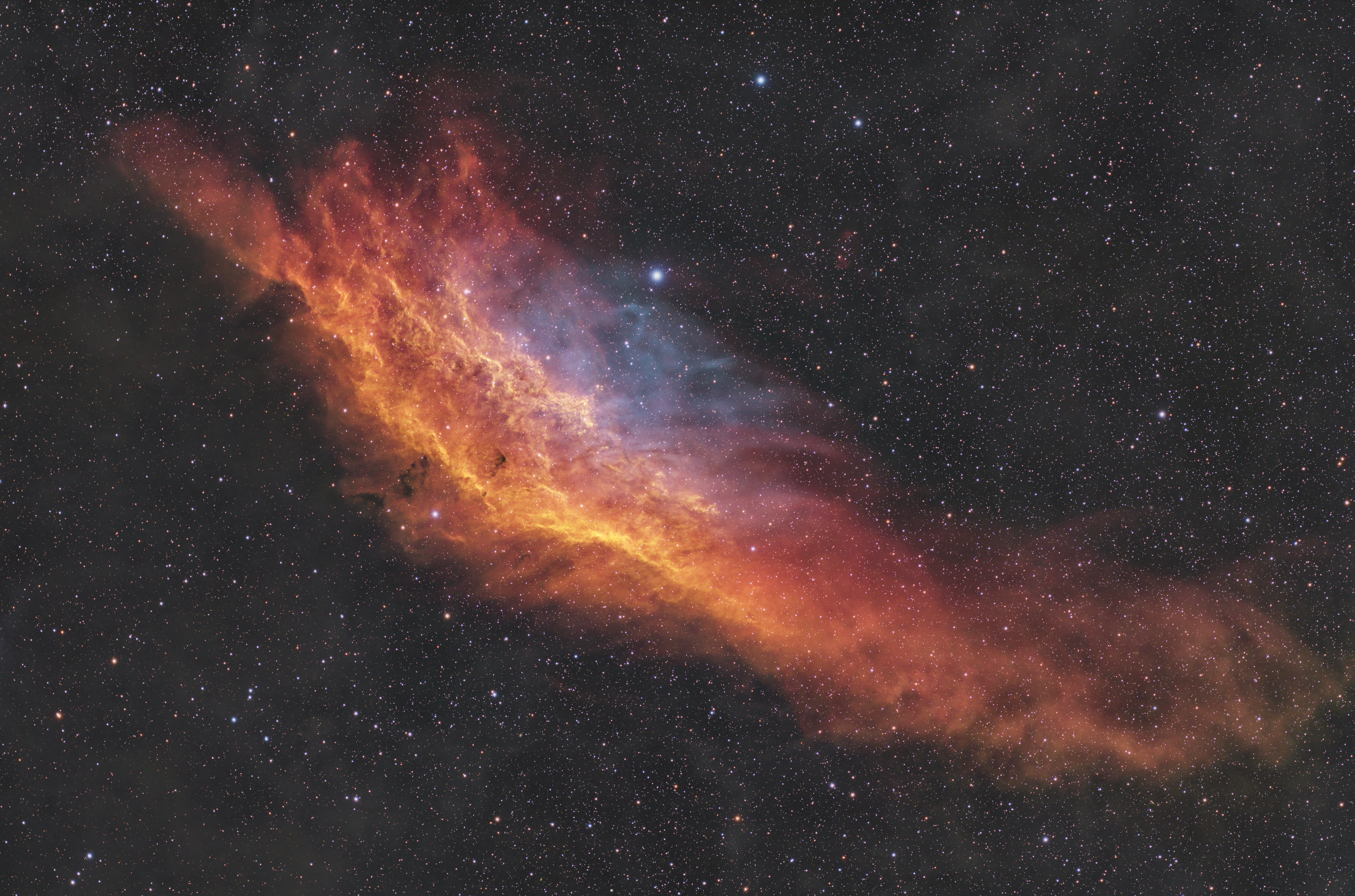 Der Kaliforniennebel (NGC 1499), ein markanter Emissionsnebel im Sternbild Perseus, liegt etwa 1.000 Lichtjahreentfernt und erstreckt sich über rund 100 Lichtjahre. Er leuchtet vorwiegend durch die Hα-Emission (Wasserstoff) und wird von der energiereichen Strahlung des Sterns Xi Persei ionisiert, einem heißen, bläulich-weißen O7-Stern.