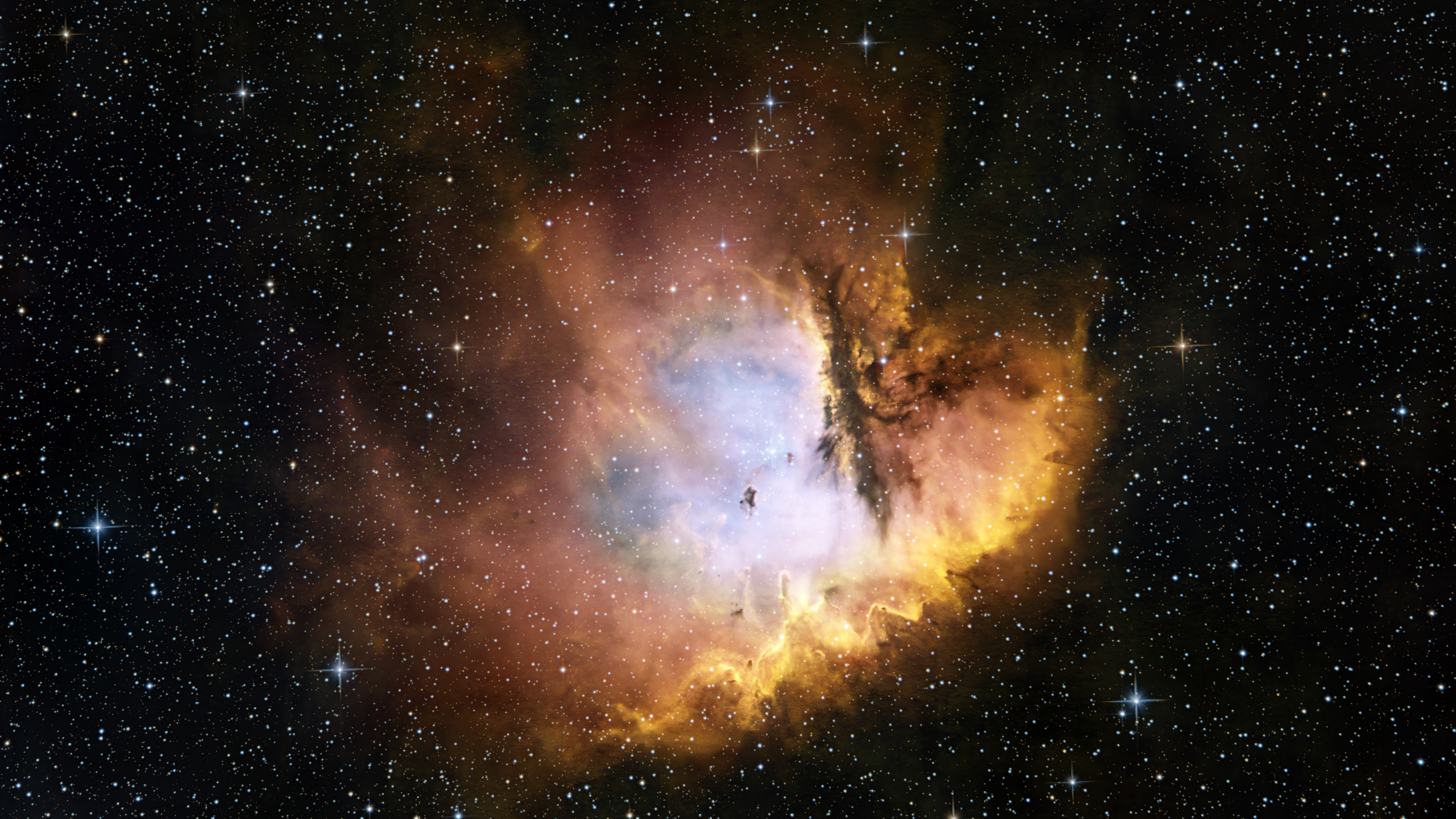 NGC 281, auch bekannt als die “Pac-Man Nebel”, ist ein Emissionsnebel im Sternbild Kassiopeia. Er befindet sich in etwa 9.500 Lichtjahren Entfernung von der Erde und erstreckt sich über eine Fläche von etwa 48 Lichtjahren. Dieser faszinierende Nebel zeigt lebendige Farben, die durch die Anregung von Wasserstoffgas durch junge Sterne erzeugt werden.