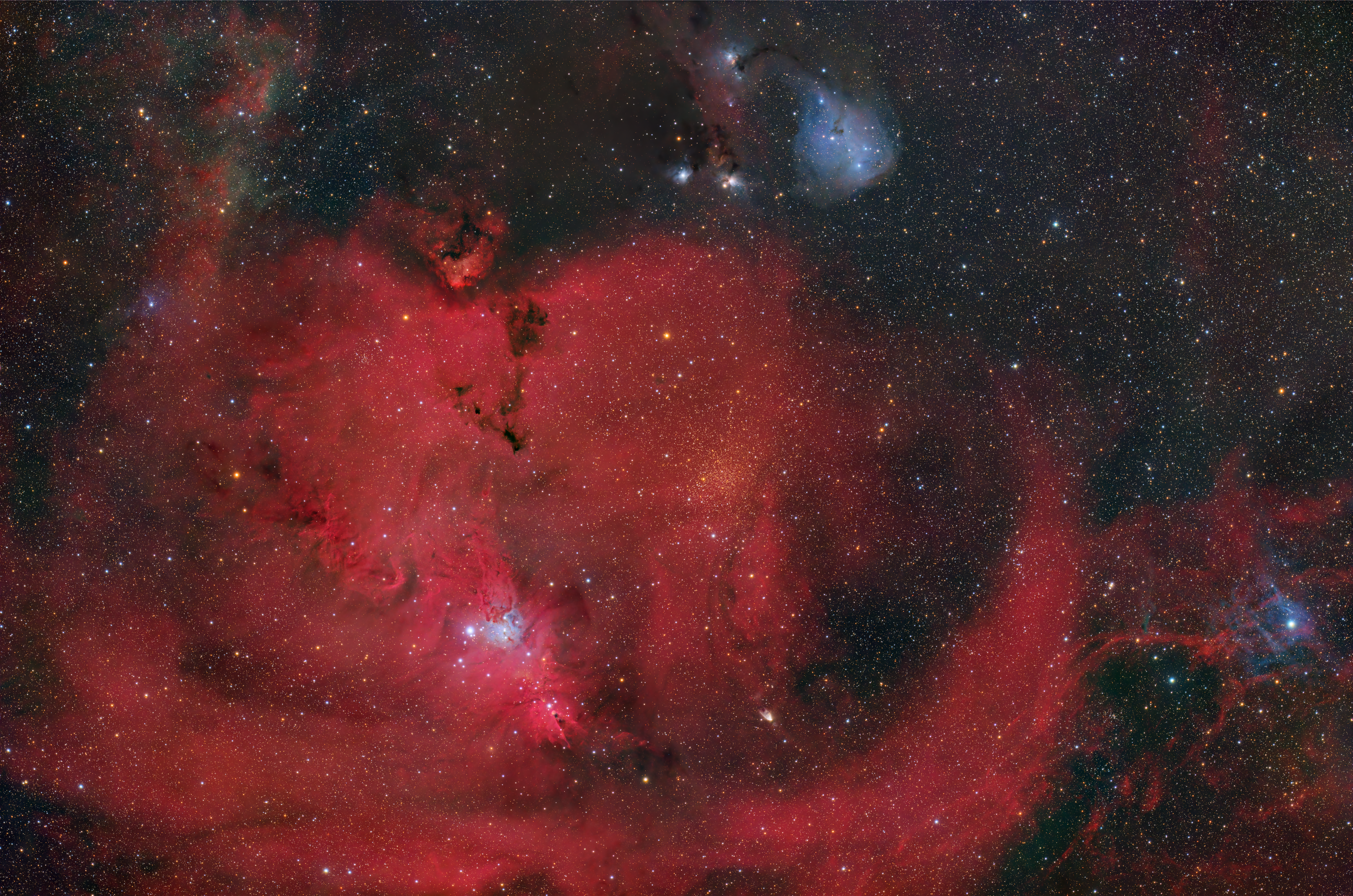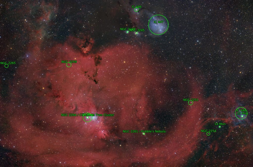 Das weitläufige Gesichtsfeld offenbart zudem weitere Objekte: NGC 2261, bekannt als Hubbles Veränderlicher Nebel, dessen Helligkeit durch vorbeiziehende Staubwolken um den zentralen Stern R Monocerotis fluktuiert. Ebenfalls sichtbar sind die Reflexionsnebel IC 447 und IC 448, die das Licht naher, heißer Sterne streuen und Teil des Monoceros OB1-Sternentstehungskomplexes sind. Eine Reihe weiterer, älterer offener Sternhaufen wie NGC 2251, NGC 2254, NGC 2259 und NGC 2265 sind über die Aufnahme verteilt und zeugen von der langanhaltenden Sternentstehungsgeschichte in dieser Region der Milchstraße.