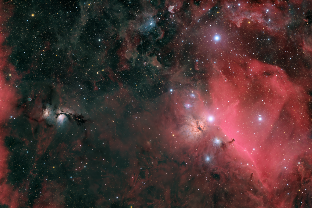 M78 hingegen ist ein Reflexionsnebel, dessen bläuliches Licht durch die Streuung des Sternlichts an feinen Staubpartikeln entsteht. Gemeinsam geben beide Objekte einen eindrucksvollen Einblick in aktive Sternentstehungsgebiete des Orionarms unserer Milchstraße.