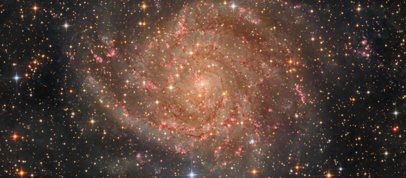 IC 342 ist eine Spiralgalaxie im Sternbild Giraffe (Camelopardalis) in etwa 10,7 Millionen Lichtjahren Entfernung.Sie gehört zur IC-342/Maffei-Galaxiengruppe und ähnelt in ihrer Struktur der Milchstraße mit ausgeprägten Spiralarmen und zahlreichen Sternentstehungsregionen. Aufgrund ihrer Lage nahe der galaktischen Ebene wird ihr Licht jedoch stark durch interstellaren Staub der Milchstraße abgeschwächt, weshalb sie trotz ihrer Größe vergleichsweise […]
